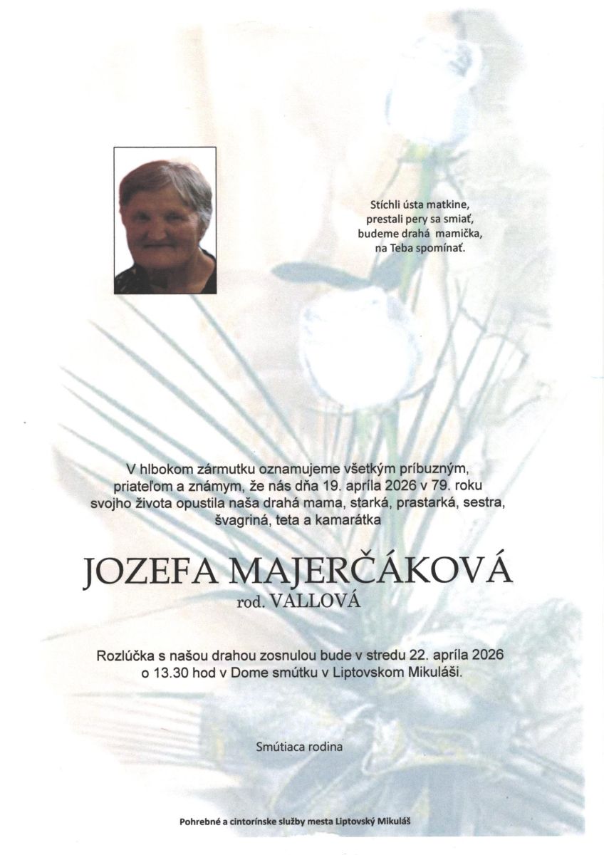 V hlbokom zármutku oznamujeme občanom, že nás dňa 19. apríla 2026, vo veku 79 rokov opustila naša občianka Jozefa Majerčáková rodená Vallová. Posledná rozlúčka s našou zosnulou bude v stredu 22. apríla 2026 o 13:30 hodine v Dome smútku v Liptovskom Mikuláši. Parte TU.