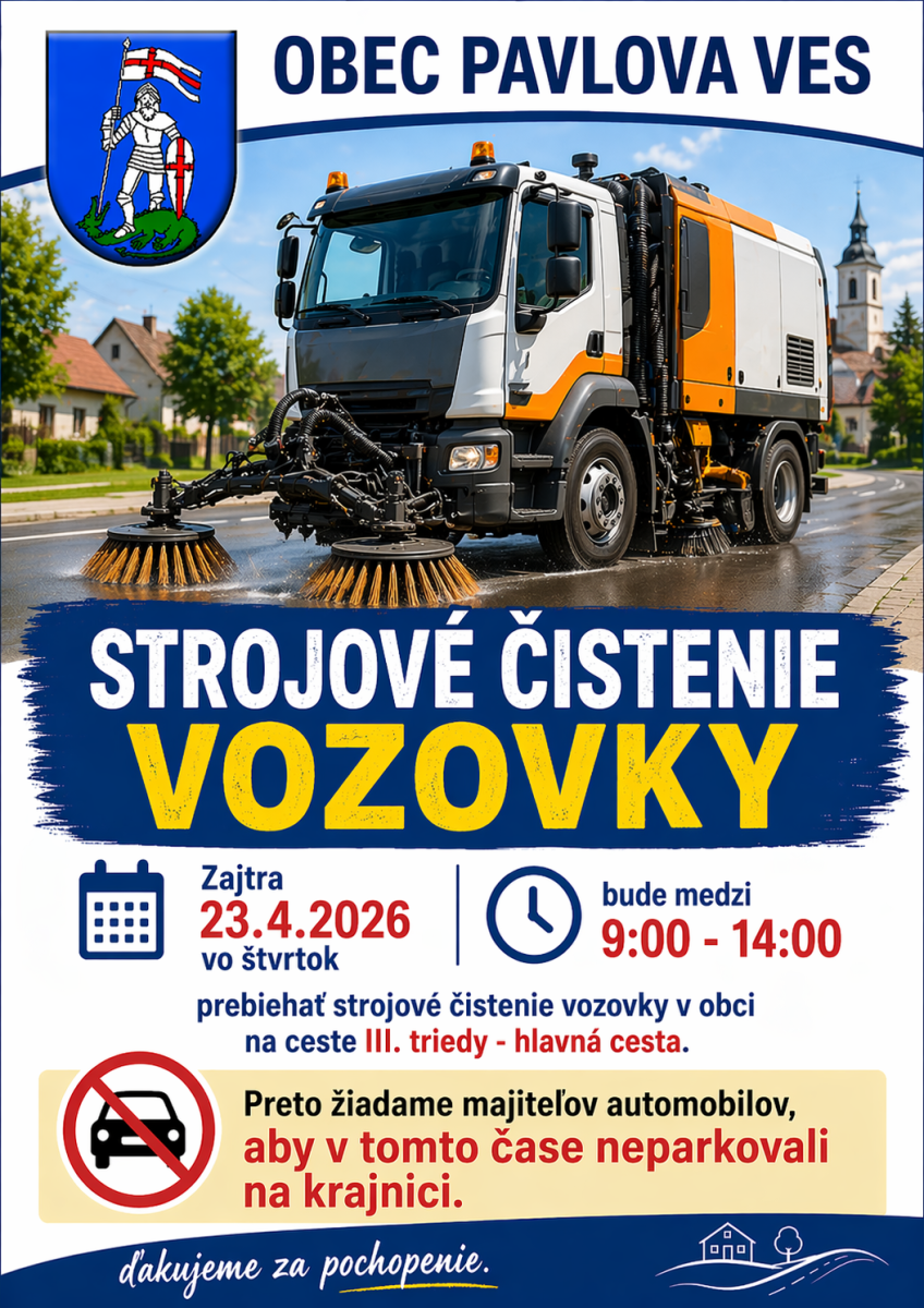 Dňa 23.4.2026 medzi 10:00 - 14:00 bude v našej obci prebiehať strojové čistenie vozovky na cesete III. triedy - hlavná cesta. Touto cestou žiadame majiteľov automobilov, aby neparkovali na krajnici. Plagát TU.