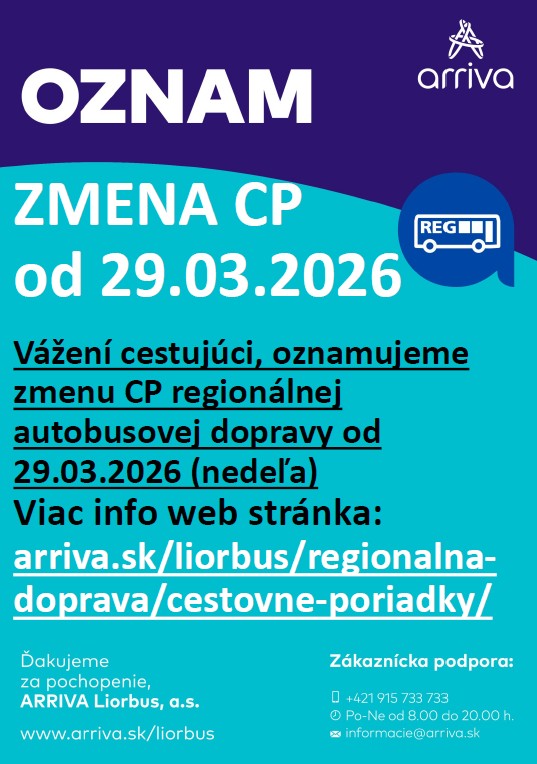 Arriva Liorbus oznamuje zmenu cestovného poriadku, ktorý začnej platiť od 29.3.2026. Na konci oznamu informačný LETAK a tiež samotné cestovné poriadky  PRILOHA1, PRILOHA2.