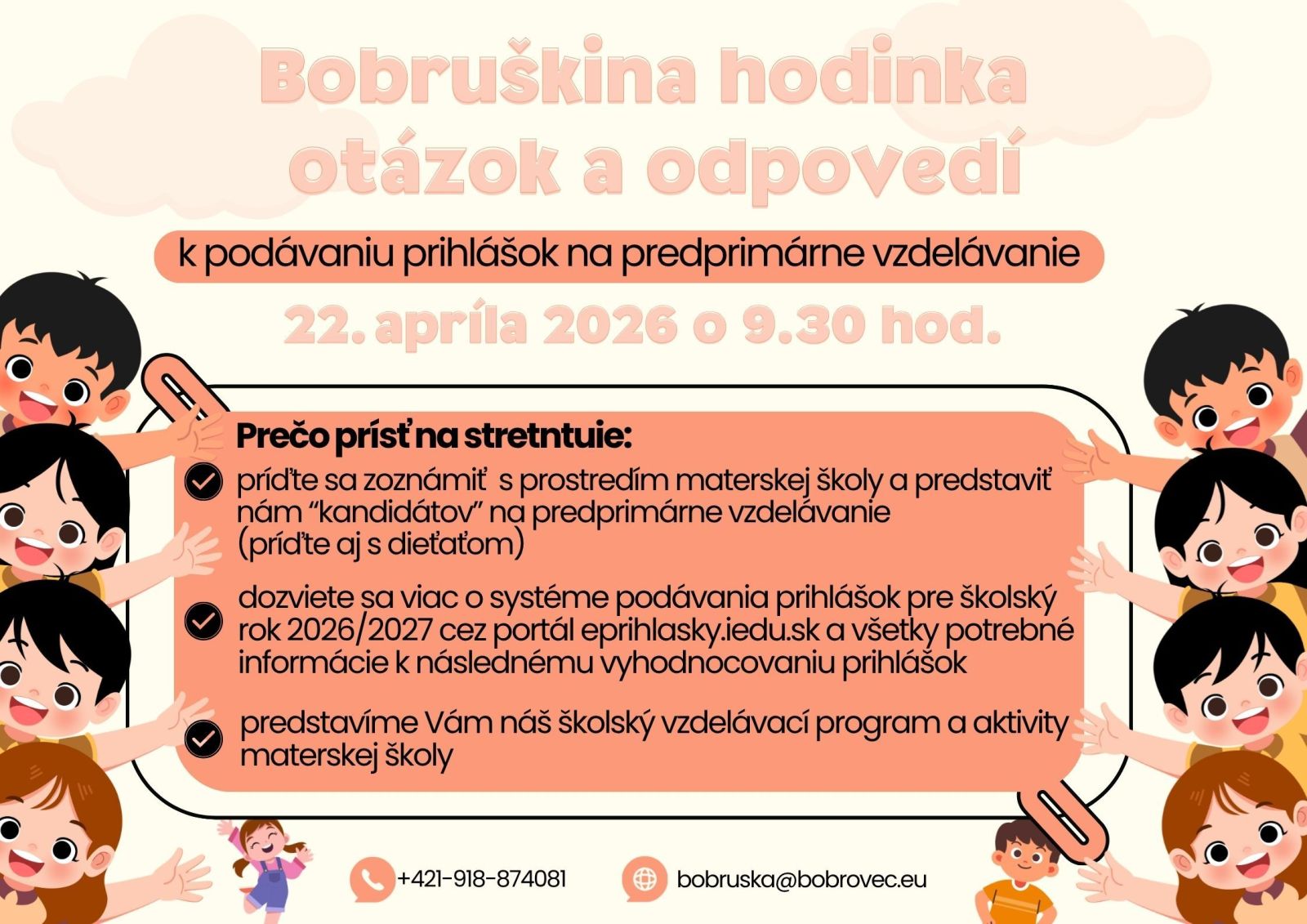MŠ Bobruška v Bobrovci zverejnila termín 22.4.2026. kedy je možné dozvedieť sa, ako vyplniť el. prihlášku a všetky podrobnosti. Info plagát TU.