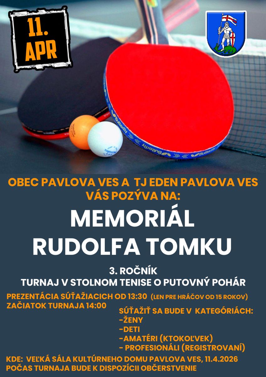 Obec Pavlova Ves a TJ Eden Pavlova Ves pozýva všetkých občanov od 15 rokov na Veľkonočný stolnotenisový turnaj o Pohár starostu obce už túto sobotu 1. apríla 2023 v kultúrnom dome. Prezentácia súťažiacich bude od 8:30, začiatok turnaja bude o 9:00. Súťažiť sa bude v 2 kategóriách: amatéri a profesionáli. Svoju účasť môžete nahlasovať vedúcemu oddielu Milanovi Kelušákovi na čísle 0948 463 545. Tešíme sa na každého. Plagát.
